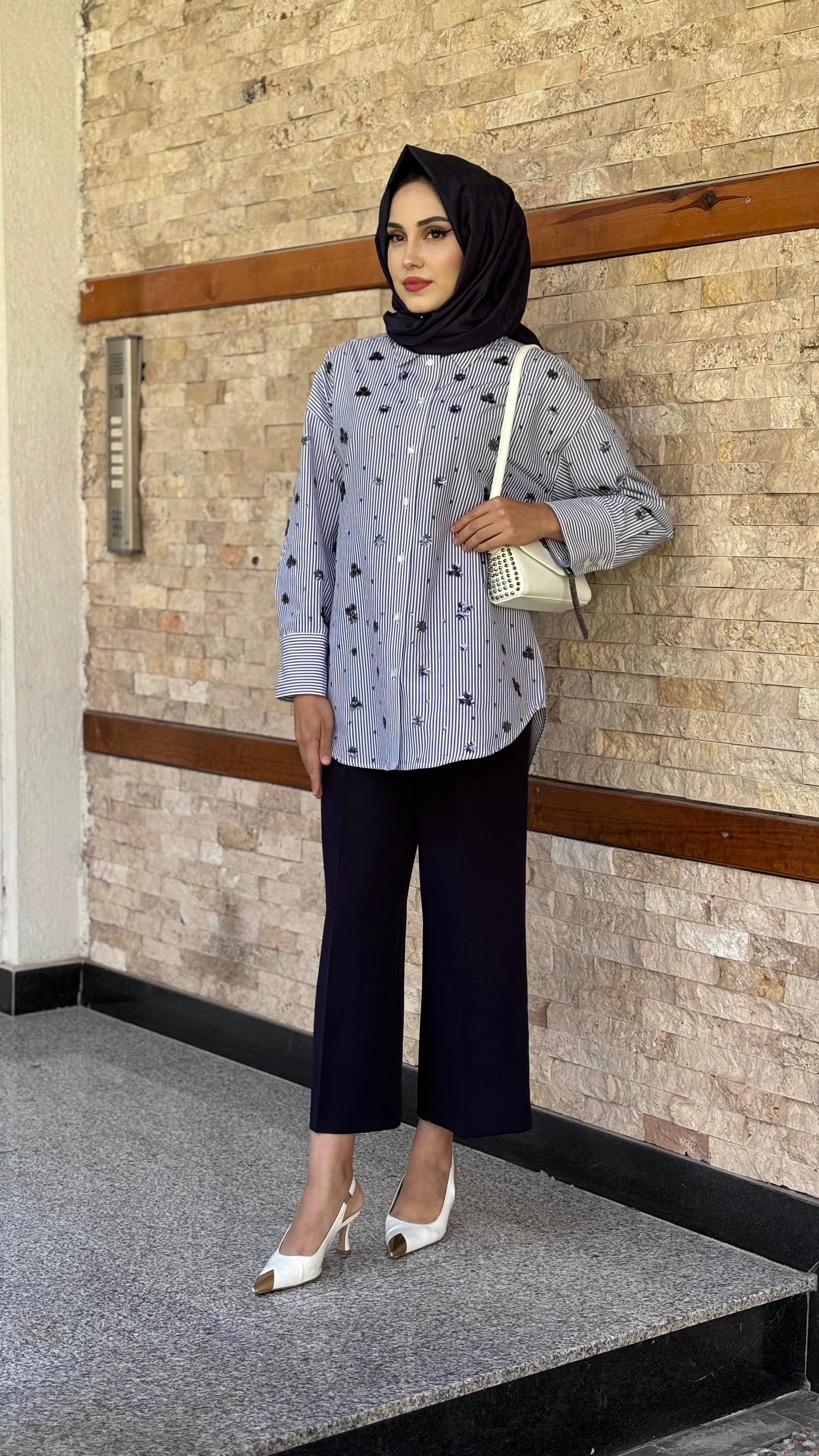 Çizgili Pul Payet Gömlek